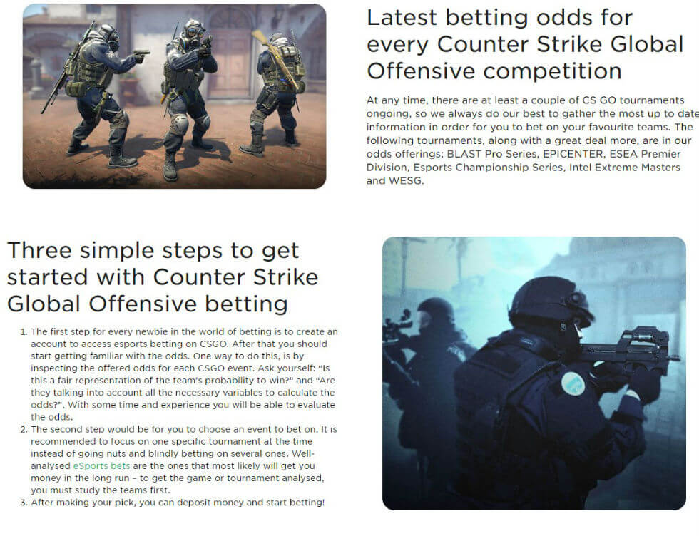 What the Mr Green website provides is a whole lot of information regarding the study of eSports markets. There is news on the latest betting odds, steps on how to properly start betting on tournaments, general tips on separate gaming titles, and some statistics. In the case of CS:GO, Mr Green’s info section points out a few strong aspects which allow players to be more calculative with their bets, supposedly giving them an edge in all provided markets.